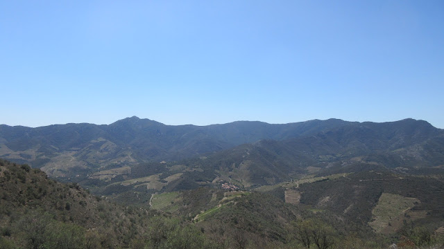 Au fond : la chaîne des Albères dont la Torre de Querroig et la Torre de Madaloc.
