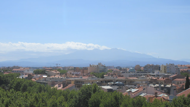 Au fond : la chaîne des Albères dont le Puig Neulós coiffé de ses antennes.